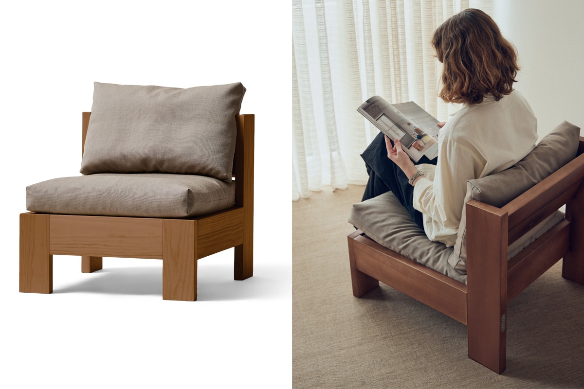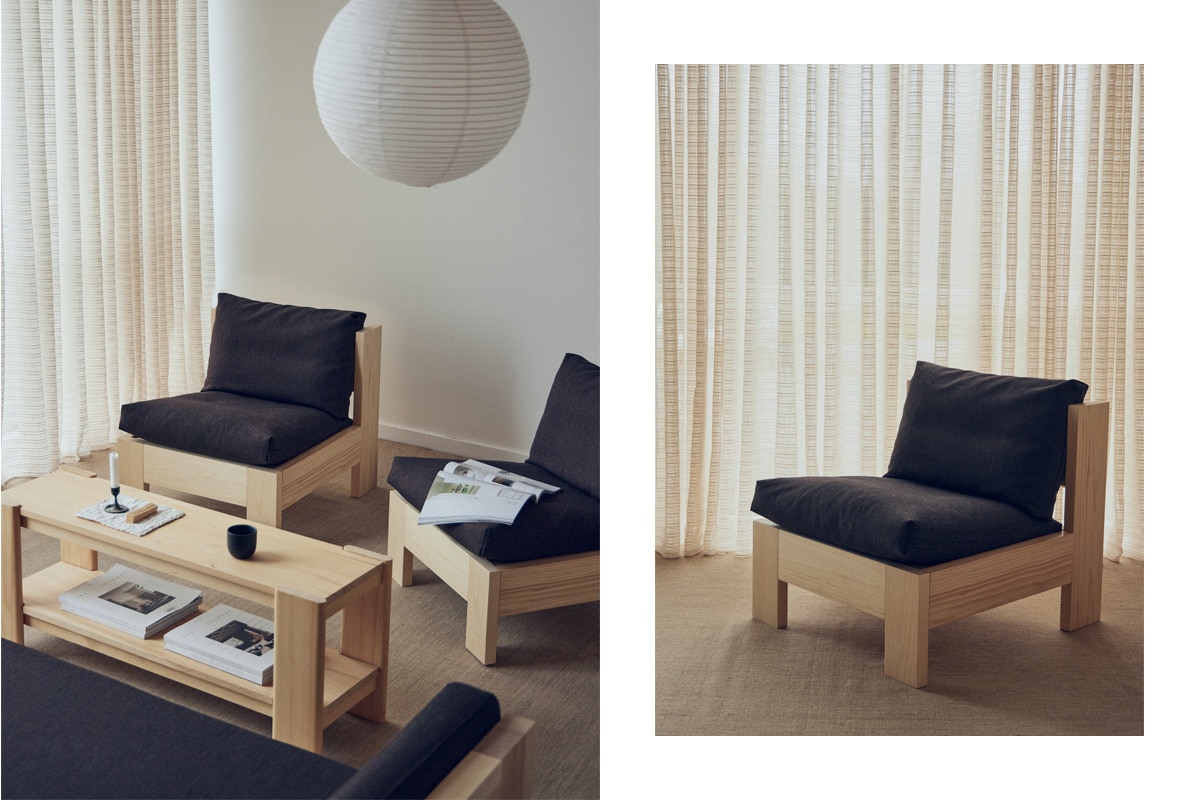 Der Icon Lounge Chair vereint auf eindrucksvolle Weise Geometrie und Materialität: Klare, kantige Holzbalken treffen auf angenehm feste und zugleich weiche Polster – ein spannungsreicher Kontrast zwischen stabiler Struktur und sanftem Komfort.
